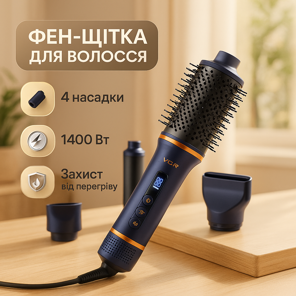 | Найпопулярніша модель | Фен щітка стайлер VGR V-408 гребінець для укладання і завивки волосся з насадками | [[ getCurrentDecimal('1176') ]] ₴ |
