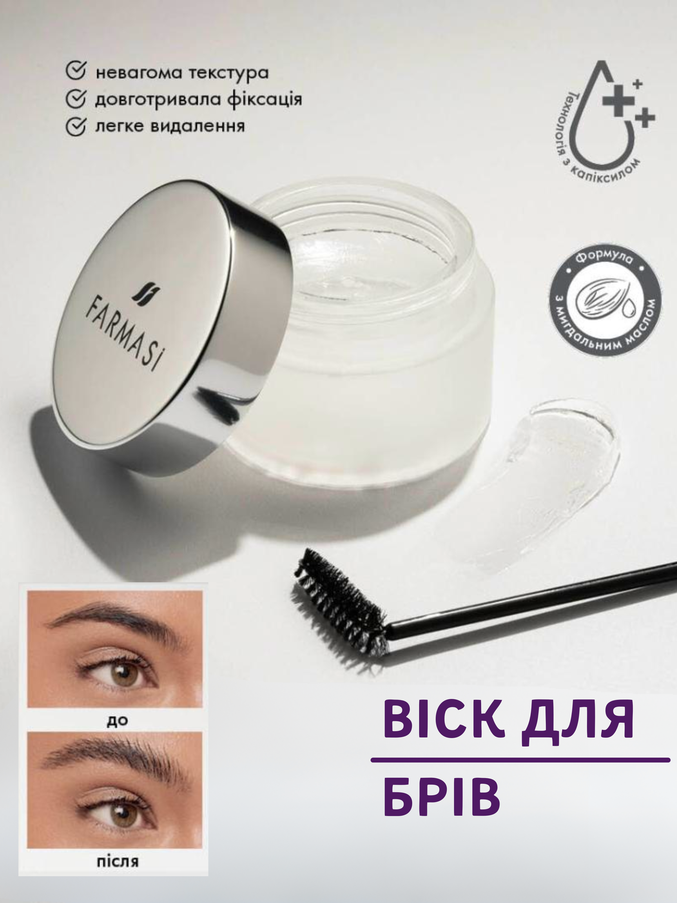 - Гель для Фіксації Брів: Зафіксовує брівки у вибраній формі та додає додатковий об'єм.