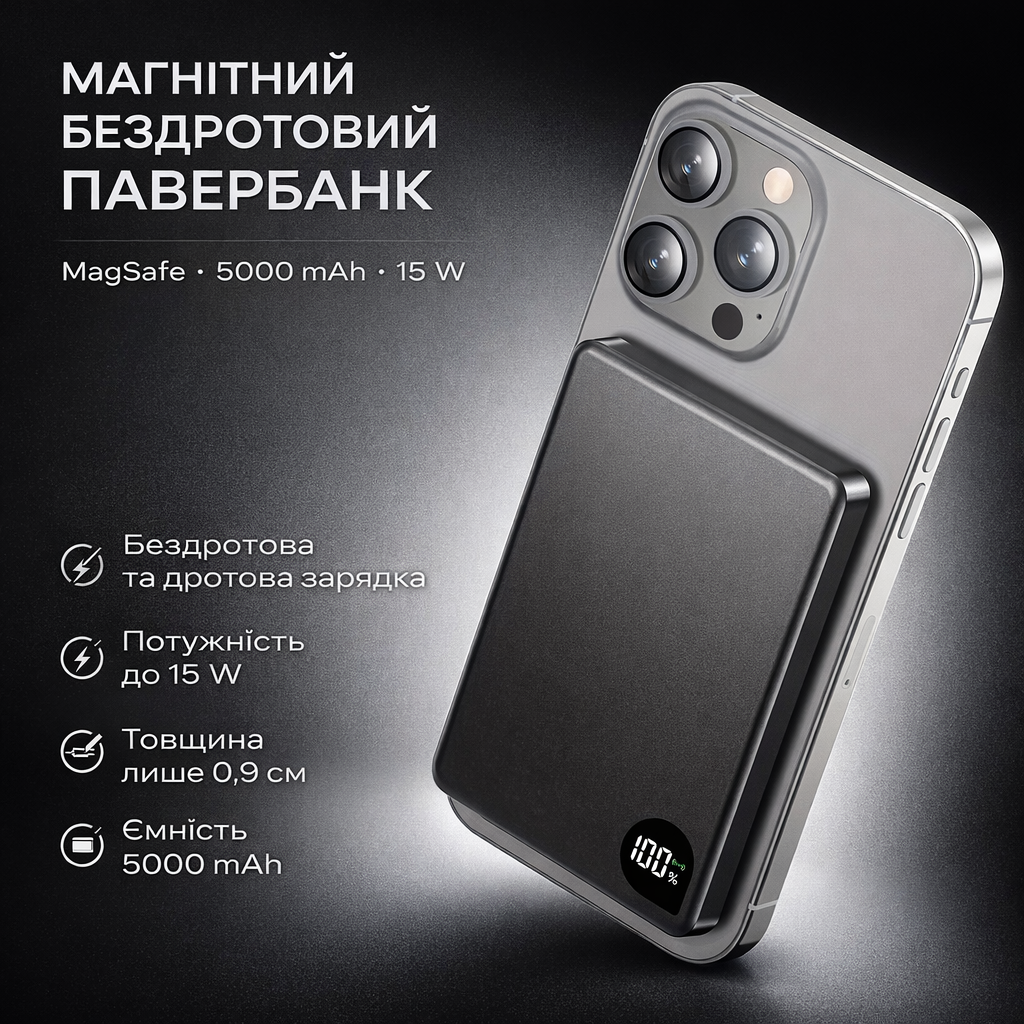 | Новинка | Магнітний бездротовий повербанк 5000 mAh MagSafe 15 W, портативний тонкий павербанк 0,9 см, Сірий | [[ getCurrentDecimal('1250') ]] ₴ |