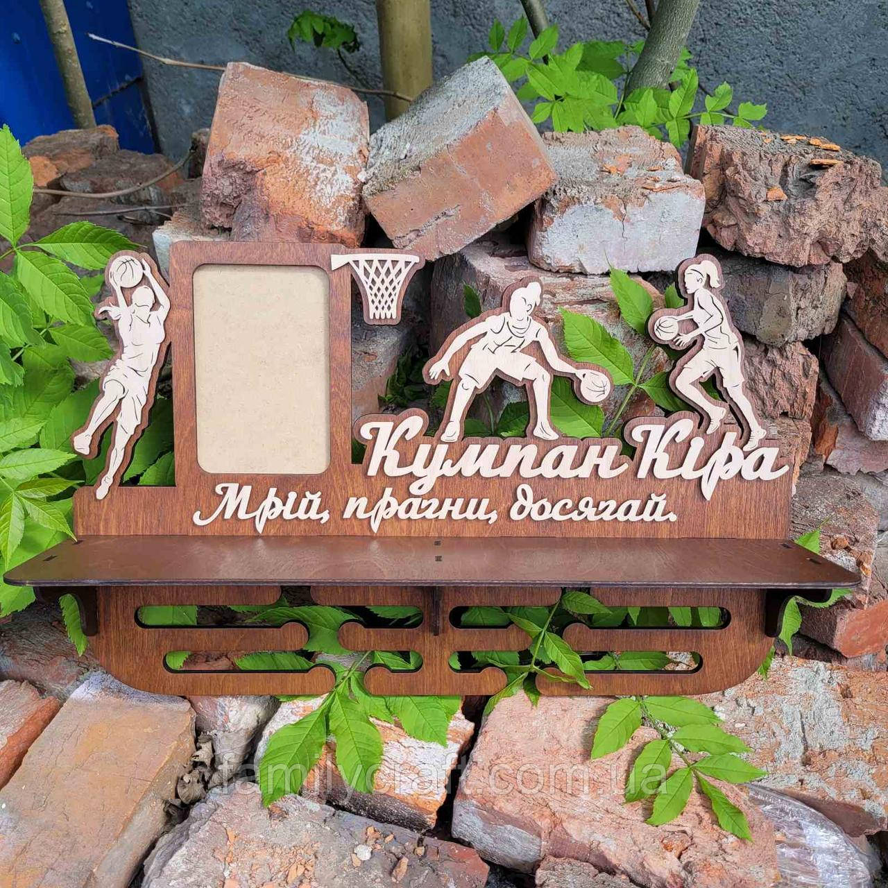 | Новинка | Медальниця з фоторамкою і полицею для кубків Дерев'яний тримач для медалей Органайзер для нагород Баскетбол | [[ getCurrentDecimal('1450') ]] ₴ |