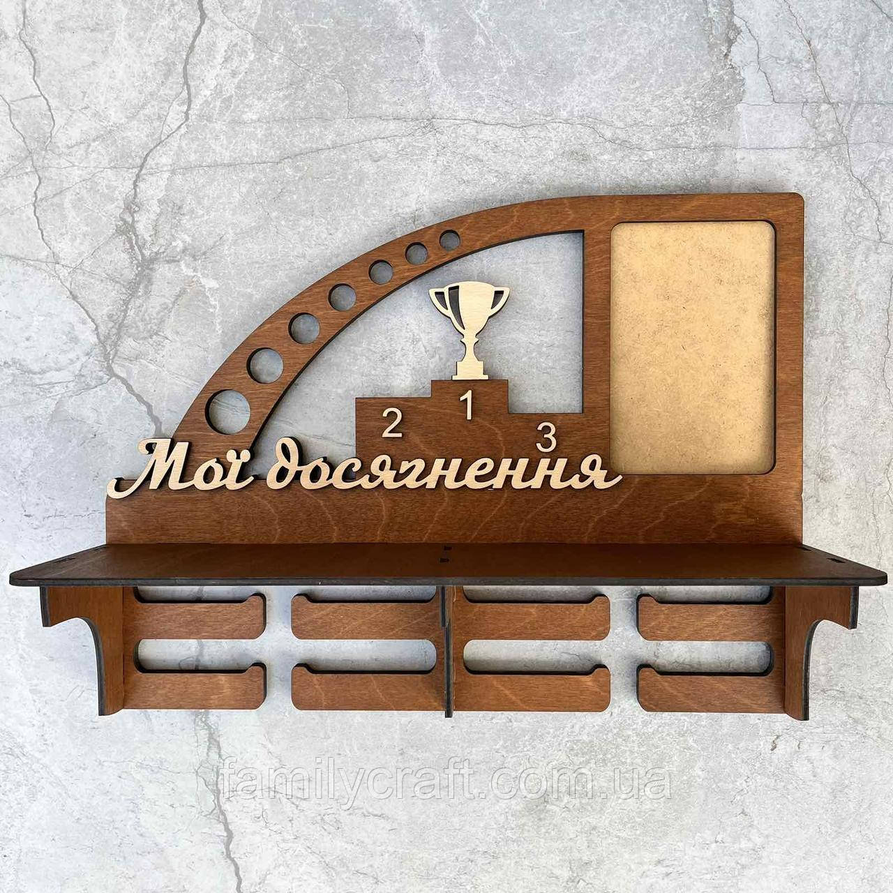 | Найпопулярніша модель | Медальниця з фоторамкою і полицею для кубків Дерев'яний тримач для медалей Органайзер для нагород | [[ getCurrentDecimal('800') ]] ₴ |