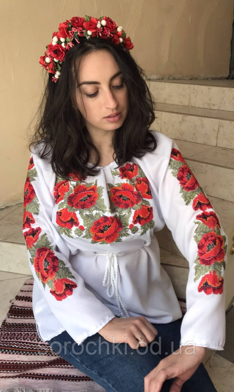 Найпопулярніша модель | Сорочка - туніка жіноча біла з вишивкою, квіти , "Маки червоні", тканина домотканная | [[ getCurrentDecimal('1300') ]] ₴ |