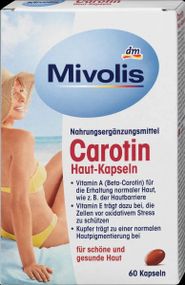 Характеристики Капсули "Каротин + Біотин + мідь + Е + В2 + В5 + провітамін А для здорової, красивої шкіри від "Mivolis", Німеччина, 60 шт.