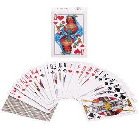 Матеріал: картон, що ламінує. Товщина картки: 0,1 мм. Кількість карток у колоді: 36 аркушів. Упаковка: картонна коробка. Призначення: для відпочинку та розваги. Підшукуєте недорогі якісні карти, якими можна буде зіграти і з родиною на пляжі, і за вкритим сукном столом із друзями? Ймовірно, одним з кращих варіантів будуть гральні карти з покриттям, що ламінує 9811. Призначення Ці карти є так званою скороченою колодою, що налічує 36 аркушів. Вона призначена для ігор, в яких за правилами більше карток просто не використовується. Таких досить багато і саме у шанувальників цих карткових ігор ця колода і користується популярністю, оскільки позбавляє необхідності постійно відсортувати непотрібні карти. Опис Для виготовлення карток використовується високоякісний ламінований картон, який, досить тонкий, проте відрізняється надзвичайною міцністю, також йому властива пружність. Завдяки цим властивостям карти залишаються рівними навіть після численних загинів, які є неминучими в процесі гри. На лицьову сторону нанесені великі, добре помітні індекси та фігури, виконані в класичному стилі, а сорочка вкрита строгим симетричним візерунком. Карти упаковані в акуратну картонну коробку.