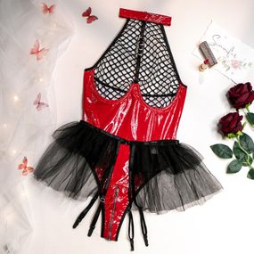 Стильний комплект із легкою спідничкою, у якому ти виглядатимеш яскраво та дуже спокусливо. Лакове боді із сіткою на грудях і застібкою на інтимному місці в комплекті з легкою шифоновою спідничкою займають бажання зануритися у світ пристрасті з нотками бунтарства. Колір: чорний/червоний Розмір: М Обхват грудей: 75-80 В,С Комплектація: боді, спідничка Паковання: пакет