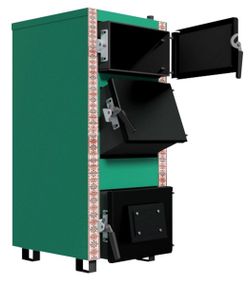 Твердопаливні котли тривалого горіння Zubr Standart 24 кВт для опалення приміщень площею до 240 м2. Котел може спалювати такі види твердого палива: дрова, вугілля, всі види брикетів, і як складова до основного палива тріска, тирса та всілякі відходи деревообробки. При виготовленні котлів використовується жароміцна, котлова сталь. Застосування котлової сталі є запорукою зносостійкості та міцності котла. Завантажувальна камера котла та теплообмінник виготовлені зі сталі завтовшки 5 міліметрів. Котел тривалого горіння серії Standart є конструкцією з поличним теплообмінником у верхній частині котла. В експлуатації цей вид теплообмінника найлегше обслуговувати. Автоматика та нагнітальний вентилятор керує процесом горіння, підтримуючи задану температуру теплоносія за допомогою зміни подачі повітря в камеру горіння. Зчитуючи температуру води на трубі з котла, автоматика регулює кількість повітря, що подається, в постійному або переривчастому режимі. Котел має три двері, верхні двері котла для чистки горизонтальних полиць теплообмінника, каскадне розташування полиць полегшує чищення котла. Середні двері котла, є завантажувальні, виконані під кутом, для зручності чищення внутрішнього теплообмінника, та завантаження палива. Нижні двері для обслуговування зольного відділення та колосникової частини котла. Так само, у нижніх дверях є люк для регулювання температури за допомогою механічного регулятора тяги з ланцюжком, що дозволяє використовувати котел без електронної автоматики, не використовуючи електрику. На кожних дверях котла є можливість регулювання густини закриття. Усі двері з ущільнювачем. Між зовнішньою обшивкою котла і теплообмінником котел має утеплювач, щоб уникнути опіків і непотрібних втрат. У верхній частині котла розташований дублюючий термометр, який дуже корисний при керуванні котлом за допомогою механічного регулювання. На всі котли діє гарантія 5 років. До базової комплектації котла Zubr Standart входить: котел; термометр капілярний; чугунний колосник; знімний короб для збору золи; гарантійний талон; інструкція експлуатації до котла.