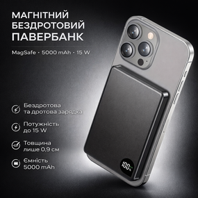 Магнітний бездротовий повербанк 5000 mAh — це компактне та стильне рішення для щоденної зарядки смартфона. Завдяки технології MagSafe павербанк надійно фіксується на телефоні та забезпечує стабільну бездротову зарядку потужністю до 15 W без кабелів.