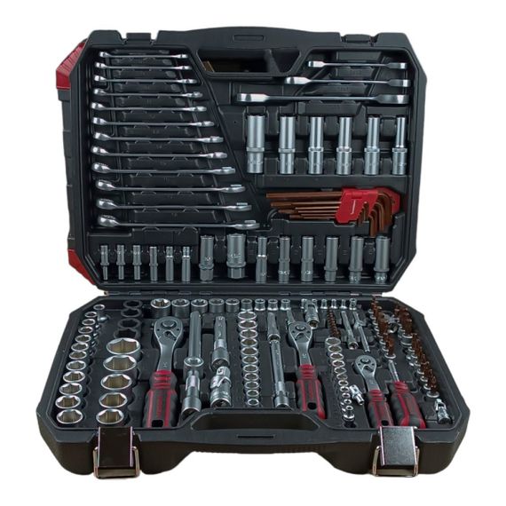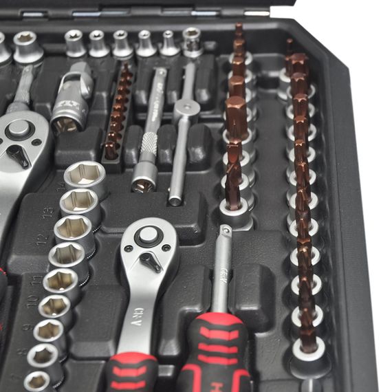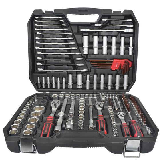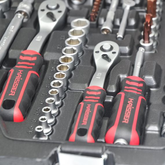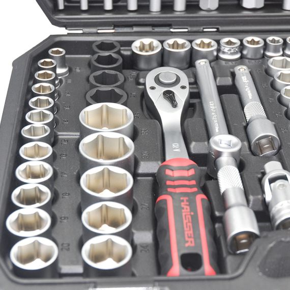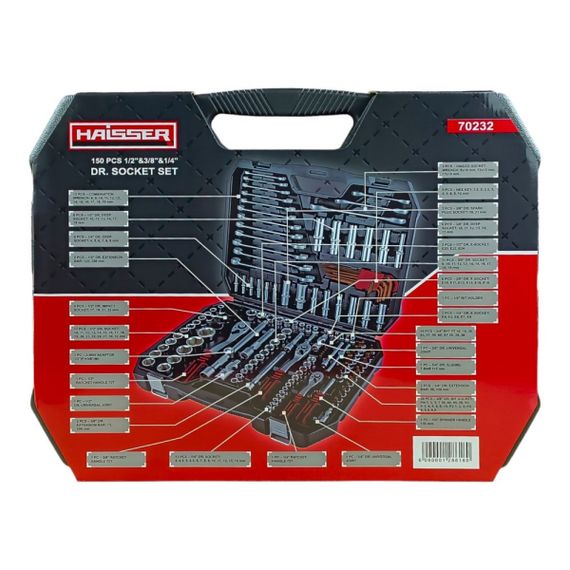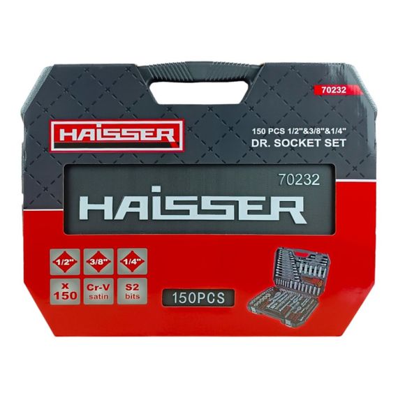 Професійний набір інструментів 1/2", 3/8", 1/4" Haisser складається з 150 предметів. Інструменти виконані з якісної хром-ванадієвої сталі. Набір постачається в пластиковому кейсі,