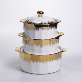 Опис Набір супниць порцелянових 3 (шт) 1.5/2/3 (л) каструлі бульйонниці з кришкою та ручками для дому та ресторану з позолотою
