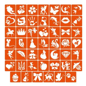 Колекція простих трафаретів для дівчаток No1, 48 трафаретів 4*4 см. Як зробити біо-тату: виберіть рівномірну ділянку шкіри; добре знежирте її; зніміть із трафарету білу підкладку (паперова основа трафарету); приклейте трафарет на суху і знежирену шкіру; акуратно зніміть прозору плівку і переконайтеся, що трафарет (помаранчева частина) щільно приклеєний до шкіри; нанесіть рівномірний шар клею для боді-дизайну і дайте йому просохнути (від 30 секунд до 2 хвилин залежно від шару клею); нанесіть гліттер (блискітки) на клей і щільно вбийте його пензлем для гліттера; змахніть надлишки гліттера пензлем-зміткою і зніміть трафарет. Для чого потрібен трафарет: якщо не вмієте малювати від руки; якщо потрібно багато і швидко малювати; потрібно створювати однакові і за розміром, і за зовнішнім виглядом малюнки - скористайтеся трафаретами Fresh Tattoo; трафарети Fresh Tattoo безпечні для шкіри та підходять для нанесення тимчасових тату всіх типів: гліттер-тату, хною, оксамитом, пігментом, джагуа-гелем тощо; підходять для хімічного або піскоструминного матування виробів зі скла (чашки, келихи, дзеркала);