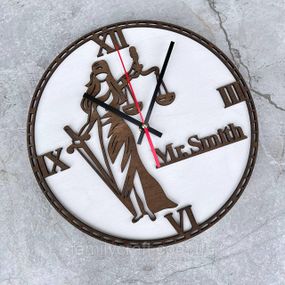 Опис Настінний годинник з дерева для юриста з Фемідою Подарунок адвокату, судді, іменний декор кабінету