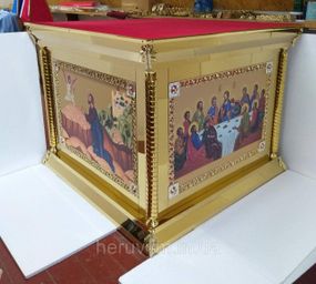 Облачення (риза) на престол 130х130см із литими латунними декоручими елементами Розмір внутрішній - 100х100см Висота - 105см Матеріал: булат (нерж.сталь з напиленням нітрид титану), основа - фанера, литі латунні декоруючі елементи; ікони - літографія із ламінацією; меблева тканина.