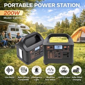Опис Портативна електростанція 200W — LiFePO4 батарея, з функцією UPS, розеткою 220В, швидкою зарядкою PD та сонячним входом.