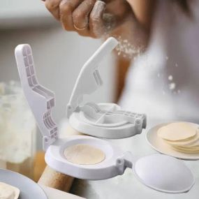 Простота у використанні. Спочатку відкрийте запірне пристрій, покладіть круг із тесту на станок, змочивши краї обертки водою. Вам краще збризнути круги з тесту кількома каплями масла, перш ніж поміщати тесто у форму. Після кожного використання просто просуйте його водою, щоб він став чистим.
