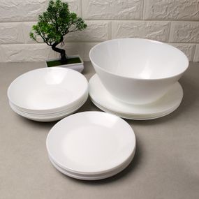 Сервіз столовий Arcopal Zelie V3792 з 19 предметів — це втілення витонченої простоти та ніжної елегантності. Виготовлений у чистому білому кольорі, цей набір створить на вашому столі атмосферу свіжості та гармонії, підкреслюючи вишуканий смак господарів. До комплекту входять 6 десертних тарілок, 6 обідніх тарілок, 6 супових тарілок й один великий салатник, що робить його ідеальним вибором для сімейних вечер і особливих заходів.