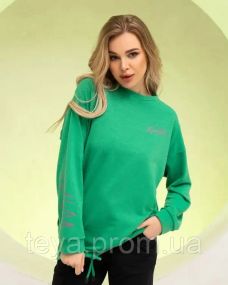 Повсякденна толстовка з написом виконана з двонитки зеленого кольору. Модель прямого подовженого крою з довгими рукавами на манжетах та О-подібною горловиною. Толстовка обладнана нижньою куліскою та кишенями.