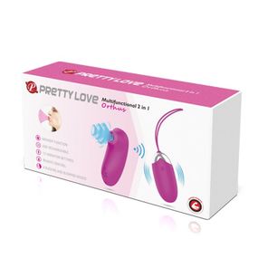 Віброяйце з 12 режимами вібрацій та функцією пам’яті, що переключаються на пульті дистанційного управління, який, крім того є вібратором з 4 функціями всмоктування. Заряджається від USB кабелю, який входить в комплект. Колір: фуксії Розмір: довжина 7,9 см, ширина 3,3 см
