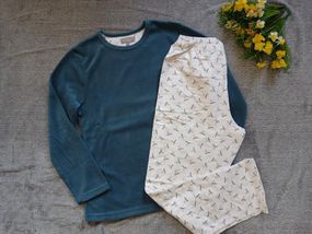 Жіночій теплий домашній костюм/піжама. Кофта махра, штани фланелеві. Розмір в наявності М. Склад: верх 100% полієстер, низ 100% бавовна. Кофта: - Плечі - 42 см - ПОГ - 50 см - Рукав - 61 см - Довжина - 71 см Штани: - Полуобхват пояс - 35 см, тягнеться до 54 см - Полуобхват бедра - 57 см, тягнеться до 60 см - Крок - 72 см - Довжина - 100 см - Штанина - 20 см