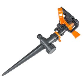 Пластиковий зрошувач пульсуючий на кілку. Регулювання кута повороту та нахилу струменя з фіксацією вибраного сектора. Зрошувач оснащений адаптером під стандартний конектор, а також додатковою різьбою для послідовного підключення з іншими зрошувачами.