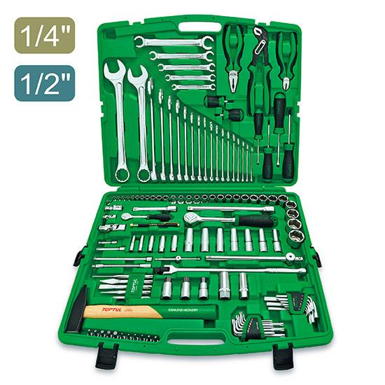 Автомобильный (94–121 предмет): две трещотки 1/4″ и 1/2″, длинные головки, удлинители, кардан, свечные головки.