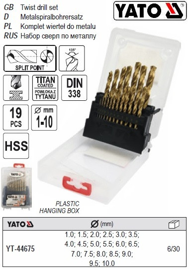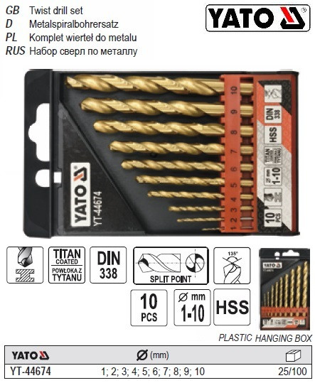 Самая популярная модель | Набор сверл по металлу YATO Польша HSS-TiN Ø=1-10 мм 10 штук YT-44674 | [[ getCurrentDecimal('427') ]] ₴ |