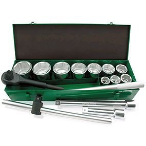 Набор содержит: 10 торцевых 6-гранных головок от 36 до 80мм, 2 удлинителя на 200 и 400мм, вороток с плавающей головкой 560мм и трещотку на 24 зубца 820мм.