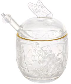 Скляна медівниця "Butterfly" зі скляною кришкою та зручною ложкою-булавою. Повний об'єм 250мл. Діаметр: 7.5см, висота з кришкою - 13см.
