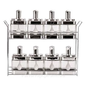 Банки для сыпучих продуктов в наборе из 8 штук — стеклянные емкости для удобного хранения с ложками, представленные на двухъярусной металлической подставке. Каждый ярус подставки вмещает по 3 банки, обеспечивая компактное и аккуратное размещение. Герметичная крышка сохранит свежесть продуктов и предотвратит попадание влаги и насекомых. Ложка в комплекте позволяет удобно набирать нужное количество продукта. Металлическая подставка обеспечивает удобное хранение банок на столе или полке. Банки можно мыть в посудомоечной машине для легкой очистки. Преимущества: Прозрачные стенки позволяют легко видеть содержимое Герметичная крышка сохраняет свежесть продуктов Ложка в комплекте для удобного набора Подходит для мытья в посудомоечной машине Стильный дизайн украсит вашу кухню