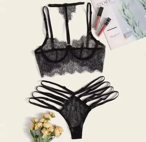 Маломерит! Когда хочется соблазнять и не раскрывать сразу все свои самые горячие точки- надень этот комплект. В этом наряде ты будешь максимально горячей штучкой с маленькой загадкой. Тонкие бретели и очень нежное полупрозрачное кружево открывают все твои достоинства но оставляют загадку для его фантазии. Комплект выполнен из нежного кружева без дополнительных вставок в виде косточек или чашек. Всё абсолютно тонко. Невесомый наряд не будет мешать во время прелюдии или активной игры с партнёром. Тактильно очень приятная ткань. В комплект входит бюст (топ) и трусики с декоративными ремешками. Бюст выполнен таким образом чтобы поярче выделить грудь, прикрыв только соски, а благодаря украшению на шею которое соединено с бюстом вы будете выглядеть просто невероятно ошеломляюще. Цвет: чёрный Размер: XL- маломерит! Подойдет на M Обьем груди: 75-80- В,C Упаковка пакет