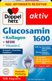 Капсулы "Doppelherz Glucosamin 1600 + Kollagen + MSM (органическая сера) + Vitamin C + Chondroitin" содержат 1600 мг. глюкозамина сульфата хлорида калия - при приеме 2 капсул в день, в сочетании с 150 мг. гидролизата коллагена, 100 мг. MSM (органическая сера).