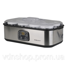 Йогуртница Sokany SK-2303 — это современное устройство, которое поможет легко приготовить домашний йогурт без добавок и консервантов. Просто залейте ингредиенты, установите время, и техника сама создаст идеальные условия для ферментации. Благодаря этой модели вы сможете ежедневно наслаждаться вкусным и полезным йогуртом, приготовленным своими руками. Основные характеристики электрической йогуртницы: Мощность: 25 Вт; Размер: 37×19.5×14.5 см; Количество баночек: 8; Объем баночек: 175 мл; Материал корпуса: металл, пластик; Материал баночек: стекло + силикон. Особенности аппарат для приготовления йогурта: Оптимальный нагрев: обеспечивает стабильную температуру для равномерного созревания йогурта. Удобные баночки (по 175 мл): удобно порционировать и хранить готовый продукт. Встроенный таймер: автоматическое отключение по завершении процесса. Энергосберегающий режим: снижает расход электроэнергии во время работы. Информативный дисплей: отображает оставшееся время до готовности йогурта. Простота ухода: все съёмные детали легко очищаются вручную, корпус достаточно протирать влажной салфеткой. Йогуртница Sokany SK-2303 — это надёжный и практичный помощник для тех, кто заботится о здоровом питании. Она делает процесс приготовления простым, а результат — вкусным и натуральным. С её помощью вы сможете радовать себя и своих близких свежим йогуртом каждый день!