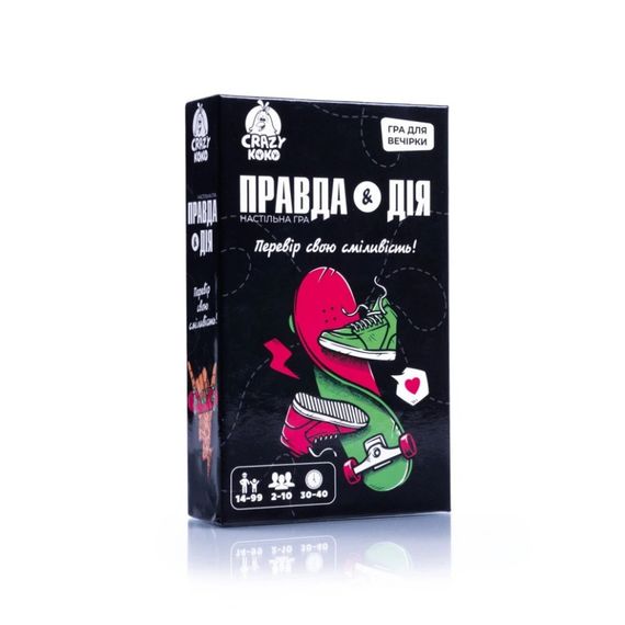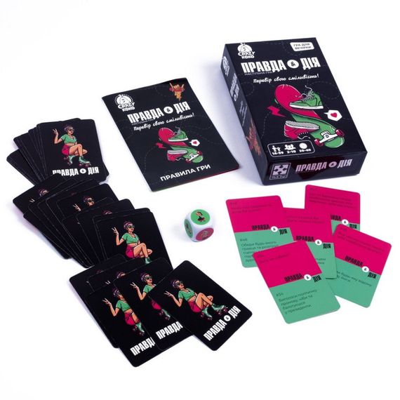 Положительные эмоции для дружной компании гарантировано с игрой «Правда или действие», представленной в несколько модернизированном варианте. Положитесь на судьбу в выборе «правда или действие». Куча интересных вопросов и не менее интересных действий на карточках игры. Игральный кубик выберет за вас! Приготовьтесь узнать что-то новенькое о друзьях или заливаться от смеха, пока они выполняют действие. Количество игроков: 2-10. Продолжительность игры: 30-40 минут. Комплектация: 50 карточек, игральный кубик, правила игры. Возраст: 14-99 лет.