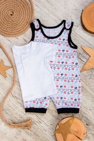 Полотно: кулір набивний Склад полотна: 100% бавовна Зріст: 56-68 Літній ясельний комплект для хлопчика (футболка + комбінезон) виготовлений з набивного куліра. Цей матеріал забезпечує оптимальну вентиляцію, дозволяючи шкірі дихати. Футболка білого кольору має планку, застібається на кнопки для зручності одягання. Комбінезон оснащений кнопками на плечах і між ніжками, що полегшує процес одягання та зміни підгузника. З укороченими ніжками, що доходять вище колін, комбінезон легко надягати, а також він зручний у використанні для активних малюків.