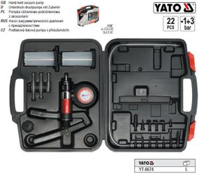 Характеристики Набор насос вакуумный диагностический YATO Польша помпа P=-1-3 Bar 22 предмета YT-0674