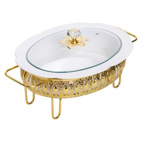 Фарфоровый овальный мармит предназначен для подачи горячих блюд с сохранением их температуры в течение длительного времени. Емкость изготовлена из керамики, которая хорошо удерживает тепло и равномерно прогревает содержимое. Стеклянная крышка удобной ручкой позволяет наблюдать за блюдом, не снимая его, сохраняя при этом аромат и тепло. Металлическая подставка обеспечивает стойкость и имеет специальное место для свечи-таблетки, используемой для обогрева. Такой способ поддержания температуры удобен во время длительных трапез, праздничных обедов или фуршетов, ведь он не пересушивает и не прижаривает блюда. Конструкция продумана так, чтобы тепло распределялось равномерно и безопасным способом. Основные характеристики мармита: Размер с подставкой: 32×23×14 см; Размер без подставки: 25×22×9.5 см; Объем: 1.2 л; Материал мармита: фарфор; Материал крышки: стекло; Материал подставки: металл. Фарфоровый мармит является не только практичным, но и эстетически привлекательным выбором для любого стола, обеспечивая удобство и стиль во время сервировки блюд. Купить мармит керамический можно с доставкой по всей Украине.