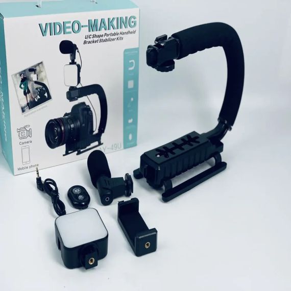 Ручка стабилизатор AY-49U для видеокамер фотоаппаратов Uобразный кронштейн для телефона с микрофоном вспышкой Видео ручка-держатель для видеокамер обеспечивает удобный захват оборудования, что дает возможность стабилизировать положение камеры при съемке. Наличие разъема типа «горячий башмак» на видео ручке позволяет установить видео-свет, вспышку или выносной микрофон или через специальные можно использовать смартфон в качестве дисплея. Имеется возможность установки видео ручки на штатив или монопод. Использование видео ручки позволяет вести съемку со сложных ракурсов. Видео ручка поможет проводить съемку при занятии экстремальными видами спорта и отдыха. Наличие специального крепежного винта на видео ручке прочно позволяет прикрепить камеру, используя гнездо для штатива. Основные параметры: 1. Квадратный отражатель света: Рабочее напряжение: 3 в Режим питания: 2 батарейки типа АА Мощность: 2 Вт Макс Цветовая температура: 6500K Ультратонкое естественное освещение CRI: 90 Количество лампочек: 49 Размеры: 66*30*81,5 мм Вес: 326 г 2. Микрофон: Размер: 9,5 см в длину и 5см в высоту Длина шнура: 50 см 3. U-образный зажим параметры: Внутренняя длина 21 см Внутренняя высота 13 см ширина дна 24 см. 4. Держатель телефона: Смортфоны до 9.5 см Длина шнура: 50 см 5. Bluetooth пульт Комплектация: 1. U-образный зажим. 2. Микрофон. 3. Квадратный отражатель света. 4. Держатель телефона. 5. Bluetooth пульт. 6. 2 шнура( для микрофона и смортфона). 7. Коробка