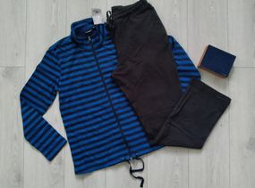 Чоловічий теплий костюм.Розмір M. Синя кофта в полоску, темно-сірі штани. Дві кишені по боках на кофті і штанах. Зав'язки внизу кофти. Тканина петельки. Склад: 70% бавовна, 30% поліестер. - Напівобхват плечі - 42 см, - Напівобхват пахви - 53 см, - Рукав - 61 см - Довжина ззаду - 66 см + 7 см комір. - Напівобхват пояс 42 см, тягнеться до 53 см, - Напівобхват стегон - 57 см, тягнеться до 64 см - Крок - 79 см - Довжина - 107 см - Штанина - 22 см