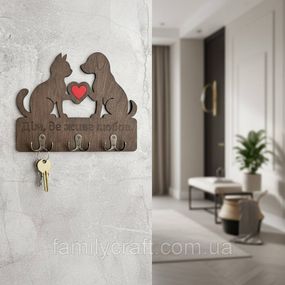 Держатель для ключей из дерева Дом, где живёт любовь ключница из фанеры с котом и собакой