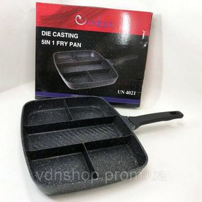 ⚙️ Сковородка удобная для кухни, Сковорода антипригарная с высокими бортами, Удобная сковорода для порций KN-18 💡 Сковорода UNIQUE UN-4021 - пяти секционный набор, который позволит приготовить разнообразную пищу сразу. 💡 Имеет прочную антипригарную поверхность. Пять глубоких отсеков позволят легко приготовить пять различных продуктов легко, в одно и то же время. 💡 Возможность быстро приготовить вкусный, завтрак яичницу, сосиски и оладьи одновременно. 💡 Особенности: • Пища не будет прилипать ко дну и стенкам при правильном приготовлении;• Пять в одном;• Эргономичный дизайн;• Корпус прочный и хорошо защищен от царапин и деформаций;• Многофункциональная и удобная;• Подходит для всех видов плит: газовой, электрической, индукционной.• После того, как пища будет готова, сковороду легко можно очистить самостоятельно под горячей водой;• Частицы гранита значительно усиливают защиту антипригарного покрытия, благодаря чему сковородка может прослужить гораздо дольше;• Возможность быстро приготовить вкусный, завтрак яичницу, сосиски и оладьи одновременно; 💡 Характеристики: • Цвет: темный гранит.• Объем: 4л;• Покрытие: гранитное;• Материал корпуса: алюминий;• Можно мыть в посудомоечной машине;• Форма: прямоугольная;• Материал ручки: бакелит;• Подходит для всех видов плит;• Диаметр: 42см;