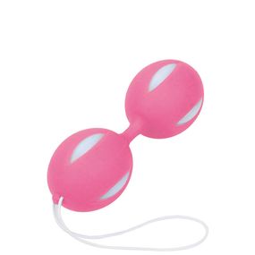 Вагінальні кульки для зміцнення м'язи піхви овальної форми з обважнювачами на м'якій зволіканні, зовнішній шар кольорової силікон, внутрішній білий пластик. Розмір: довжина двох кульок - 10,7 см, горизонтальний діаметр однієї кульки - 3,6 см. (окружність - 11,4 см.), вертикальний діаметр однієї кульки - 4 см. (окружність - 12,8 см.), Вага 58 грам. Матеріал: силікон, пластик, метал. Упакування: крейдована картонна коробка з віконцем і прозорий сформований блістер.